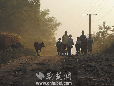 學生們踏著晨霧趕往學校。