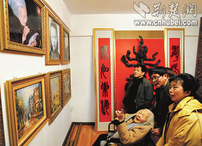 “這是特意為您準(zhǔn)備的生日禮物!”年過六旬的盧永瀚攙扶著92歲的母親,在根雕、油畫面前仔細(xì)講解!斑@個(gè)根雕是壽字!”孫女插話說:“就是祝您長(zhǎng)壽,活過100歲!”慧老太太邊看邊比劃著,樂得合不攏嘴,用濃重的江浙口音說:“好、好!”