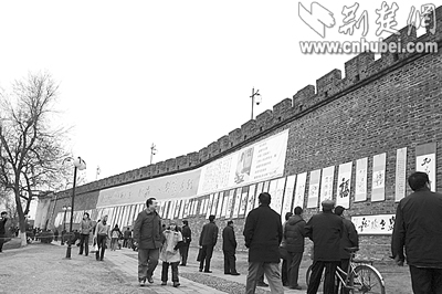 荊楚網(楚天都市報)(記者釋喻 攝)前日上午,襄樊西門橋古城墻上舉辦了一場別開生面的書法展,近百幅作品被懸掛在城墻上,向市民免費展出,展覽為期7天。此次活動由襄樊市文聯(lián)等單位舉辦,展出的是書法家王樹人先生的遺作和其傳人的近期作品;顒蝇F場還進行了書法義賣,所得款項將用于襄樊歷史文化名城的保護和宣傳工作。