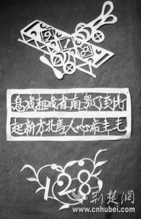 中國剪紙起源于裝飾藝術(shù)。樣式有窗花、燈花、喜花以及鞋墊花等。其中用來制作繡花底樣的雕花剪紙又名“花樣”,主要是供婦女刺繡使用的圖案底稿,大多是與民眾日常生活關(guān)系密切的傳統(tǒng)圖案。此次發(fā)現(xiàn)反映抗戰(zhàn)主題的50多張花樣剪紙,從構(gòu)圖、技法上看,比較稚嫩、粗糙,但充分體現(xiàn)了藝人們的創(chuàng)新精神。其中最顯眼的是一張邊緣殘缺、破舊的黃裱紙,上面依稀可見“兒童團(tuán)”三個(gè)字,是唯一的一張剪紙?jiān)。葉家慶介紹,寫著“打到了鄂南省減租減息,毛主席心(新)人馬北方新起”(如左圖)的花樣,從內(nèi)容分析,反映了1944年新四軍各軍區(qū)對(duì)日偽軍發(fā)動(dòng)春夏秋季攻勢,并粉碎日偽軍反撲,解放國土、人口,改善華中各抗日根據(jù)地的斗爭形勢。