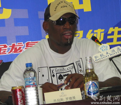 在記者會上,曾和喬丹、皮蓬一起被稱為“公牛鐵三角”、七屆NBA籃板的丹尼斯.羅德曼格外引人注目,記者圍繞著一些球迷感興趣的話題對他進行了采訪。當有人問起他為什么在見面會上會這么平靜時,他的回答幽默又讓人充滿期待:這里有這么多的攝影機、照相機和記者朋友,施展不開,當然要平靜。賽場上的我和此時的我完全不同,想看一個真正的羅德曼,明天去賽場吧。