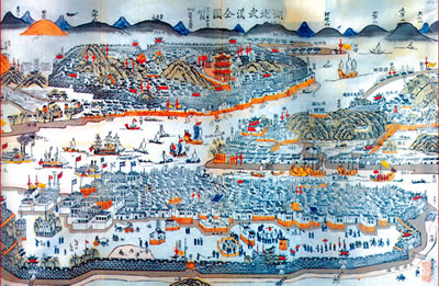 地圖顯示:武漢當(dāng)時(shí)就已形成漢口城、武昌城、漢陽(yáng)城三足鼎立,成為我國(guó)的商貿(mào)重地。