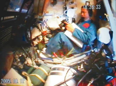 17時29分,航天員向地面飛控中心報告飛船工作正常,已做好開啟返回艙艙門的準(zhǔn)備。在得到地面指揮員的指令后,費俊龍打開返回艙艙門,在聶海勝的幫助下進(jìn)入軌道艙工作。