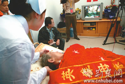 英雄母親聶媽媽躺在病床上觀看兒子飛天。本報(bào)記者張進(jìn)攝