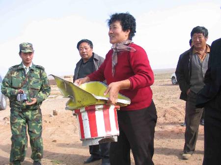 記者在搜索現(xiàn)場看到,從四面八方趕來的牧民群眾個個都有所獲!肮剑藗兂Uf天上掉餡餅,這不應驗了?”牧民張金虎指著自己撿到的一堆殘骸,興奮地開著玩笑。牧民烏云還向記者炫耀,她和丈夫烏力吉今天特意起了個大早,在家焚香默默祝愿神舟六號飛船試驗成功,所以今天他們撿到的殘骸最多,能裝滿滿一車。