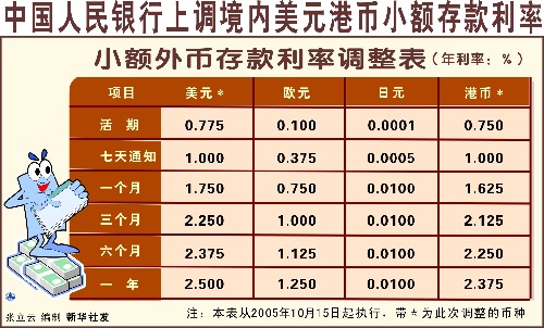 中國人民銀行決定自2005年10月15日起上調(diào)境內(nèi)商業(yè)銀行美元、港幣小額外幣存款利率上限。其中,一年期美元、港幣存款利率上限均提高0.5個百分點,調(diào)整后利率上限分別為2.5%和2.375%(詳見附表)。