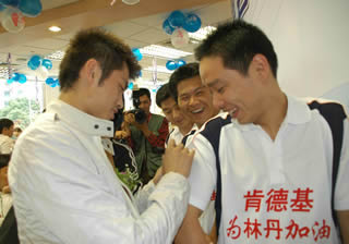 剛剛獲得十運會羽毛球男單冠軍、世界排名第一的林丹,繼李小鵬、李婷和孫甜甜之后,榮獲肯德基“體壇群英三號”稱號,并在十運會所在地南京上演了一出精彩的肯德基體壇群英會。
