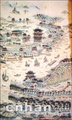 此圖藏于大連市圖書館,手繪彩圖。未標(biāo)明作者姓名和成圖時(shí)間,圖中標(biāo)注了武昌、漢口“龍王廟”等。筆者鑒定此圖為清代中期作品,根據(jù)是圖中有“龍王廟”,而龍王齋建于乾隆四年(1739年),故此圖當(dāng)于1739年以后所繪。但圖中沒有出現(xiàn)漢口城堡,而漢口城堡建于1864年,同時(shí)圖中只繪有木帆船,而未出現(xiàn)現(xiàn)近代輪船。武漢江面出現(xiàn)航運(yùn)和輪船是1862年以后?芍藞D當(dāng)成于1862年前。可大體界定此圖繪于1739年至1862年之間。