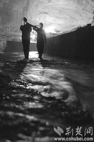寂寞的蝙蝠第一次接待了人間來客,沉睡萬年的巖溶洞穴第一次迎來了觀者。但黑暗陌生的世界還是讓堂堂男兒們感覺了一絲陰森恐怖。他們曾聽當(dāng)?shù)匕傩諅髡f,洞里有巨蟒,所以至今沒人敢進(jìn)洞。“抓緊時間測量!”來不及恐懼,他們?yōu)樽约汗膭,因為這里隨時可能發(fā)生漲水、墜落等危險?上В谝淮谓(jīng)驗不足,手電筒的電池很快用完了,一行人只得互相攙扶著,摸索出溶洞!昂髞,我們又進(jìn)去了7次,終于測出了暗河的具體位置和流向!狈轿奈湔f。