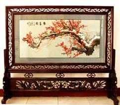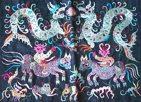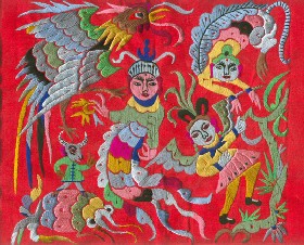 苗繡 刺繡,是苗族婦女盛裝不可或缺的飾物,主要有領(lǐng)花、肩花、襟花、背塊花、袖口花、裙鑲花、帽頂花、帽頂花等品種。苗族刺繡,整體上多為幾何構(gòu)圖,古樸多姿。其圖案因繡片條、塊的不同,分為幾何二方連續(xù)式和四方連續(xù)式構(gòu)圖。其圖案取材于生活中常見的草木、鳥獸、蟲魚、器具等。圖案的整體布局一般以菱形為立體紋樣,常見的是大菱形中套小菱形,小菱形又分別由不同色彩的方、圓、三角點(diǎn)狀組成。條狀繡片,多用點(diǎn)、線或線面組合,一整二剖構(gòu)圖。繡片是按布的經(jīng)緯戳針,故曲線多折角。大塊繡片,如背塊花等,多用菱形四方連續(xù)構(gòu)圖,并在其中布以對稱的變形幾何點(diǎn)及其他折線。所有繡片,粗看五彩斑斕,細(xì)觀則不同色線組圖分明,交錯重疊,既復(fù)雜多變又結(jié)構(gòu)嚴(yán)謹(jǐn)、條理清晰。繡法很多,有平繡、凸繡、辮繡、堆花、縐繡、纏繡、挑繡、抽花等。平繡是最曾遍的繡法。這種繡法是重于圖案布局的美觀勻稱,色調(diào)鮮明,有明顯的物象感。凸繡流行于凱里、臺江部分地區(qū),它是在底布上多鋪幾層紙花,使所繡圖案凸出,有立體感。辮繡只在雷公山巴拉河一帶流行,其方法是將若干根色線編成辮子,按設(shè)計(jì)圖案平鋪于底布上,用絲線釘牢即成。圖案色調(diào)大致是青年女子鮮艷,中年以上婦女稍渾暗。如凱里、黃平、施秉等地,姑娘及較年輕婦女的盛裝刺繡以青布作底,繡大紅,間有少量白黃綠之色,亮麗醒目;中年以上婦女盛裝刺繡,亦以青布作底,以紫藍(lán)為基調(diào),間以少許桔紅、綠、白等色,顯得深沉穩(wěn)重。 京繡 京繡又稱宮繡,明清時(shí)期開始大為興盛,多用于宮廷裝飾、服飾,用料講究、技術(shù)精湛、格調(diào)風(fēng)雅,民間高檔的宮繡大都與皇宮有著千絲萬縷的聯(lián)系。京繡屬手工刺繡,所以在今天機(jī)繡發(fā)達(dá)的時(shí)候,為區(qū)別于機(jī)繡又名“手繡”。京繡在解放后,逐漸形成了自己鮮明的藝術(shù)特點(diǎn)與風(fēng)格,其選料精當(dāng)貴重,針工巧妙得體,色彩絢麗豪華,格調(diào)高雅。其中最好為針工中的“平金打籽”繡。這種繡,是以真金捻線盤成圖案,或結(jié)籽于其上,十分精致,華貴。 發(fā)繡 發(fā)繡,又稱“墨繡”。是以人的頭發(fā)為材料,在綢緞、絲絹或滌綸布上精心繡制的特種藝術(shù)品。具有淡雅、不褪色、耐腐蝕、利于收藏等特點(diǎn)。彩色發(fā)繡是相對于單色發(fā)繡而言,它是指以不同人種的天然色澤發(fā)絲為材料,遵循色彩規(guī)律,在繃平整的布帛上施針度線,塑造形象的藝術(shù)。作品的質(zhì)感效果特別好, 畫面有微妙的色彩變化,層次較單色發(fā)繡豐富,技巧靈活多變,形象更加栩栩如生。 材料的特質(zhì)屬性賦予發(fā)繡藝術(shù)獨(dú)特的魅力,具有豐富的人文內(nèi)涵,如用自己的頭發(fā)繡一幅寫真“二我”,具有生命的直接紀(jì)念意義。作品集繪畫與刺繡為一體,具有一定的美學(xué)價(jià)值和經(jīng)濟(jì)價(jià)值,又能經(jīng)久保存,千年不變,可謂收藏極品。 甌繡 由于溫州地處甌江之濱,故得名“甌繡”。400多年以前,浙江溫州地區(qū)已運(yùn)用刺繡美化服飾, 繡品技藝也達(dá)到相當(dāng)水平。據(jù)說甌繡最早產(chǎn)生于民間婦女之手,那時(shí)的刺繡品種有衣服、小兒帽 圈、圍涎、錦肚、婦女鞋面、枕頭、荷包等。題材只有花鳥魚蟲之類。甌繡真正成為供欣賞的藝 術(shù)品只有60多年歷史。1922年前后,溫州刺繡藝人林森友在上海一家刺繡莊發(fā)現(xiàn)了湘繡畫片, 回來后開辦了“美艷”刺繡作坊,仿照湘繡畫片的技法,改進(jìn)甌繡生產(chǎn)。從此,溫州出現(xiàn)了甌繡畫片。