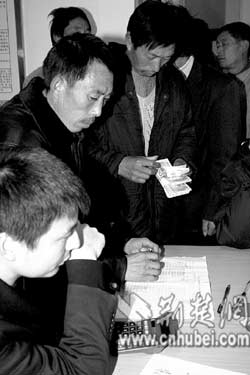 荊門麻城鎮(zhèn)譚珍國等農(nóng)民工,在天門市勞動保障監(jiān)察大隊(duì)領(lǐng)取用人單位所欠的工資款(上圖)。去年12月以來,天門市組織有關(guān)職能部門對全市37家用人單位支付農(nóng)民工工資情況進(jìn)行專項(xiàng)檢查,共查出6家用人單位拖欠農(nóng)民工工資,他們及時為2056名農(nóng)民工追回工資180余萬元(下圖)。(特約記者肖金舫通訊員劉銀斌攝)