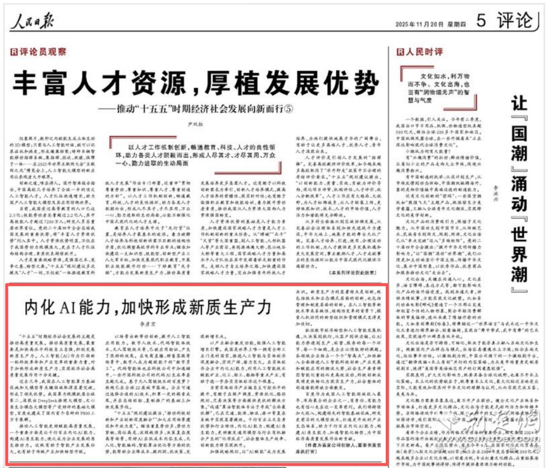荊楚網(wǎng)(湖北日報網(wǎng))訊(通訊員 杜軒)11月20日,百度創(chuàng)始人、董事長兼首席執(zhí)行官李彥宏在《人民日報》發(fā)表題為《內(nèi)化AI能力,加快形成新質(zhì)生產(chǎn)力》的署名文章。他指出,推動人工智能更好賦能高質(zhì)量發(fā)展,一個重要方面是讓千行百業(yè)內(nèi)化AI能力,構(gòu)建AI原生能力,使之成為企業(yè)發(fā)展的原生推動力。