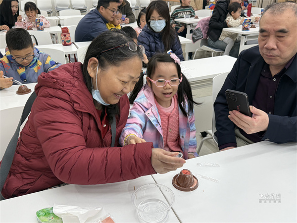 為讓抽象原理更直觀,活動設置模擬火山噴發(fā)實驗環(huán)節(jié)?,F(xiàn)場備好黏土火山模型、小蘇打、白醋等物料,容東林一邊操作一邊講解:向“巖漿腔”倒入小蘇打并加紅色素,再注入白醋,紅色“巖漿”瞬間噴涌而出,引得居民驚嘆、孩子們目不轉睛。他引導大家觀察全過程,深入淺出解釋酸堿反應原理及火山灰對生態(tài)環(huán)境的影響,還邀請孩子們近距離體驗,激發(fā)科學探索興趣。