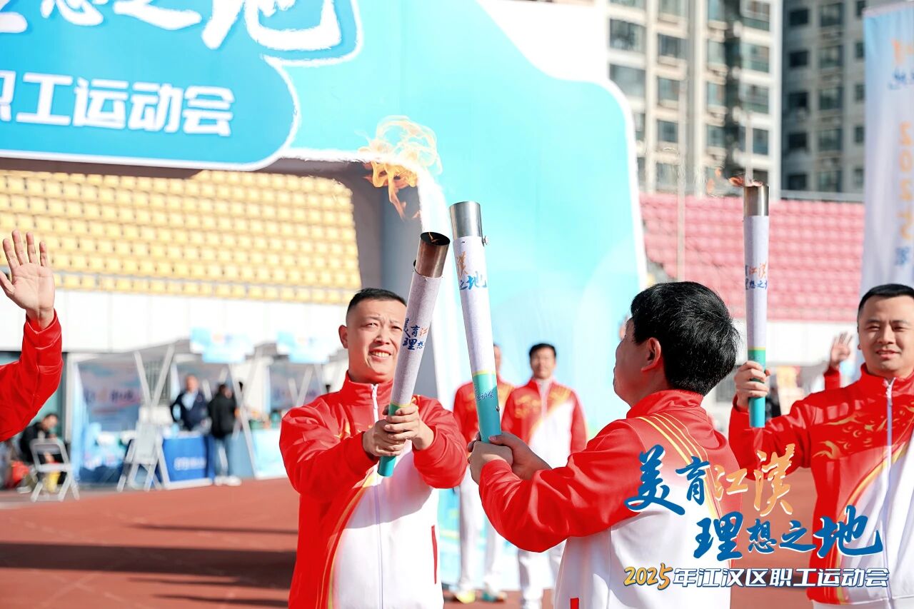 現(xiàn)場,“新興之火”“數(shù)智之火”“金融之火”“樞紐之火”“人文之火”五棒火炬依次點亮,張裕、付俊、邵青、張寶劍、孟廣松等15位勞模代表接力傳遞。燃燒的火焰,照耀著江漢區(qū)在科技創(chuàng)新、數(shù)字化轉型、金融強區(qū)、商貿(mào)物流、文商體旅融合等發(fā)展領域堅定向前。當所有火炬手共同點燃主圣火盆,彩球騰空,全場沸騰,運動會正式開幕。