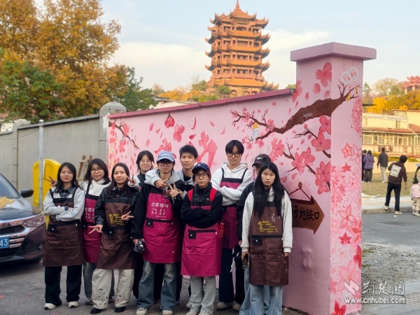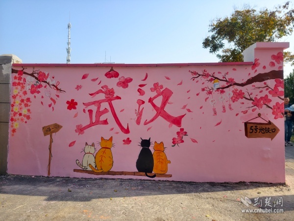 次日,創(chuàng)作進入精修階段。志愿者們細致調(diào)整“武漢”字樣的色彩飽和度,用粉白顏料層層暈染出飛揚的櫻花花瓣。四只形態(tài)各異的貓咪相依蹲坐,靈動可愛;特意添加的“5號地鐵口”指引牌等實用元素,更讓作品兼具藝術(shù)性與功能性。創(chuàng)作過程中,不斷有居民和游客駐足觀賞,主動詢問設計理念?!拔覀兿胪ㄟ^櫻花、貓咪等元素,展現(xiàn)武漢的浪漫與煙火氣。”志愿者一邊調(diào)色一邊向圍觀群眾講解。