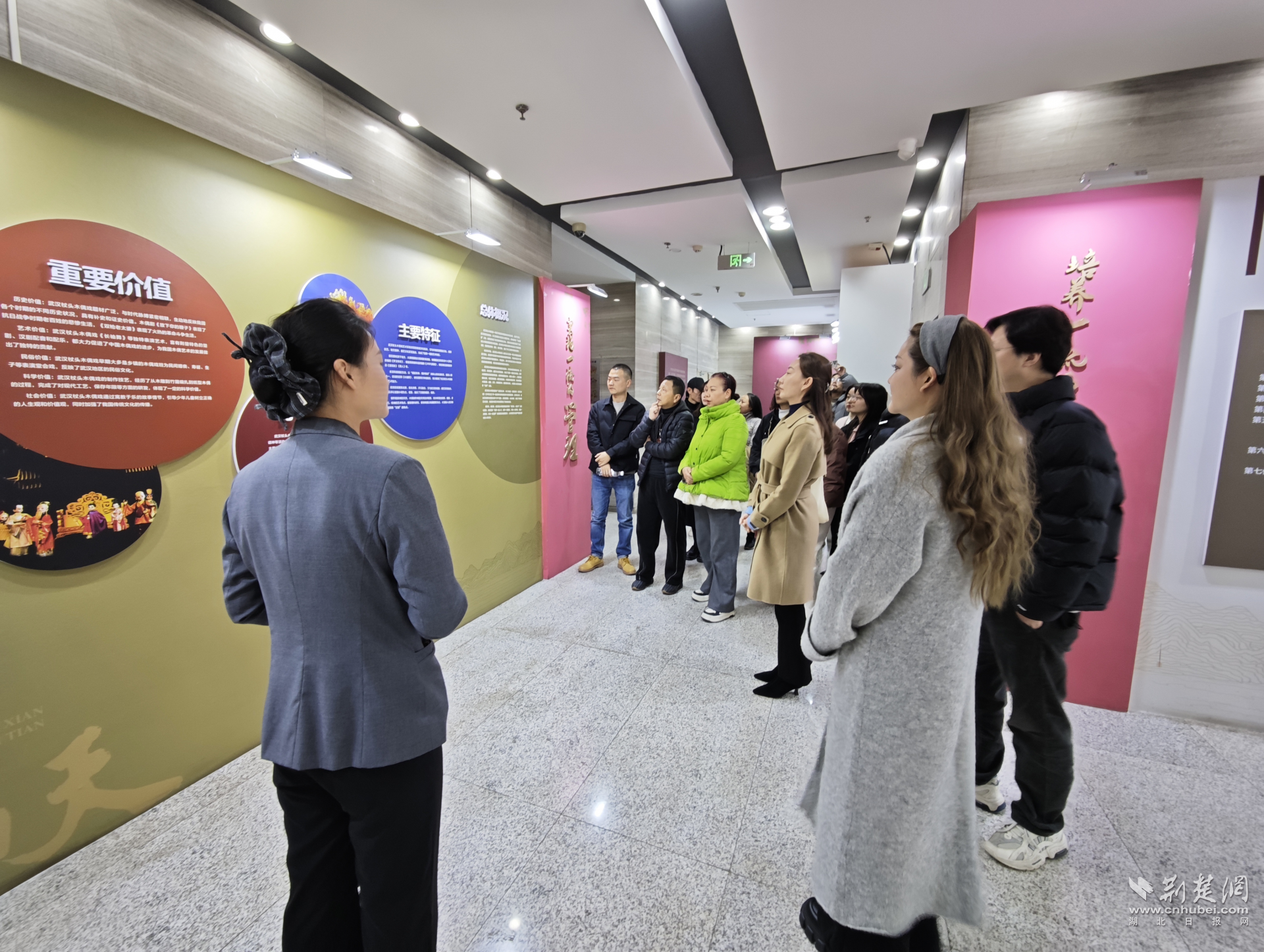 隨后,一行人來(lái)到武漢杖頭木偶戲?qū)n}展。在非遺傳承保護(hù)人的講解下,大家近距離了解杖頭木偶的制作工藝、表演技巧及保護(hù)傳承成果。一刀一刻的匠心、一舉一動(dòng)的神韻,讓成員們直觀感受到傳統(tǒng)藝術(shù)背后的時(shí)間厚度與文化力量。