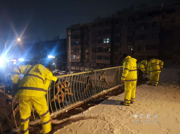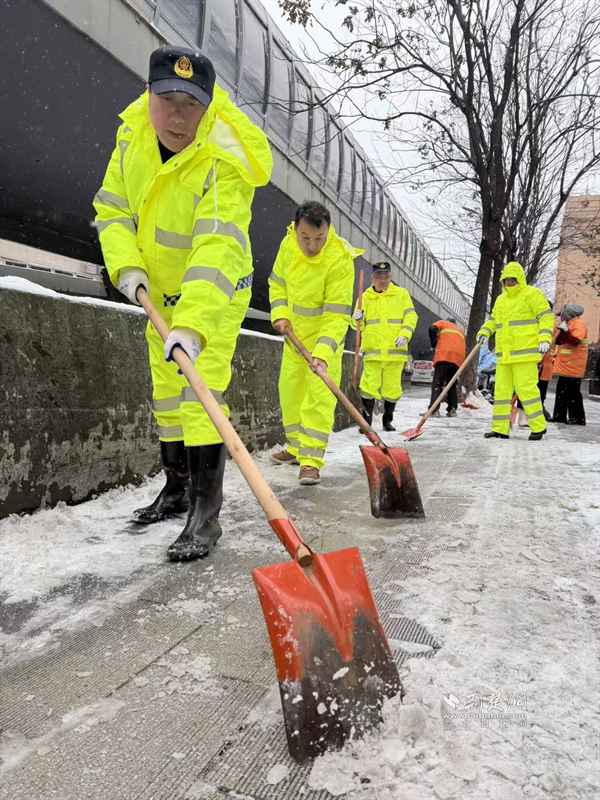 1月19日深夜至20日凌晨,隨著雪勢加大,街道應急搶險隊伍迅速化身“風雪夜行人”,頂著嚴寒奔赴一線。他們采取機械作業(yè)與人工作業(yè)相結合的方式,對轄區(qū)主次干道、橋梁、陡坡、十字路口等重點路段和易結冰區(qū)域,進行循環(huán)撒布融雪鹽和清掃作業(yè),最大限度預防道路結冰。寒夜中,隊員們衣衫被雪花浸濕,臉頰被寒風凍紅,但無人退縮,持續(xù)堅守。天色微明,雪勢稍歇,隊伍立即轉戰(zhàn),對背街小巷、人行道、天橋等區(qū)域的殘留積雪進行清理,并在坡道、臺階等易滑處鋪設防滑草墊、設置警示標識,全力保障早高峰出行安全順暢。