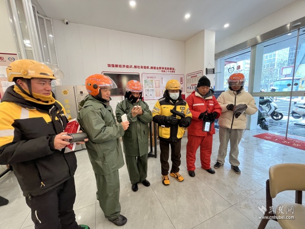 武昌區(qū)總工會(huì)維權(quán)服務(wù)部負(fù)責(zé)人夏巨波與街道工會(huì)工作人員一邊分發(fā)慰問物資,一邊與大家親切交談:“雪天路滑,騎車千萬要慢行,安全第一?!薄绑A站里備了熱水和微波爐,累了隨時(shí)進(jìn)來歇腳,別凍著自己。”