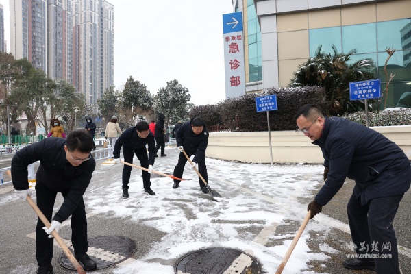 武漢大學人民醫(yī)院黨委書記、院長與干部職工一同清掃院區(qū)積雪。 通訊員供圖