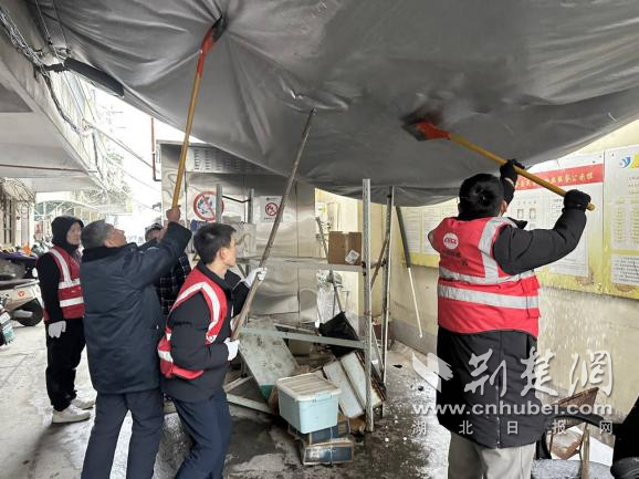 除雪過程中,工作人員發(fā)現(xiàn)一處老舊小區(qū)宿舍門前遮雨棚因積雪堆積嚴(yán)重變形,存在垮塌隱患。大家立即分工協(xié)作,有的手持長桿清理棚頂積雪,有的在下方拉起警戒線、疏導(dǎo)居民通行,及時(shí)消除了高空墜物風(fēng)險(xiǎn),為居民撐起一把“安全傘”。