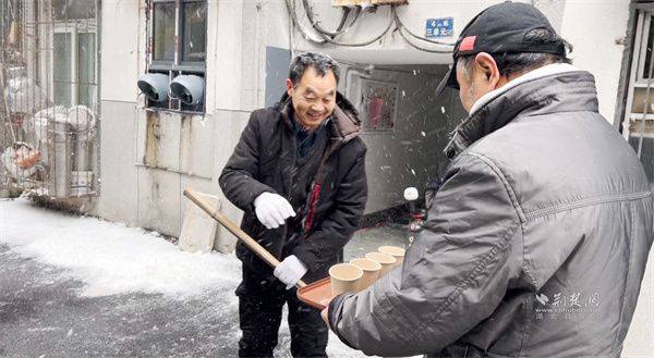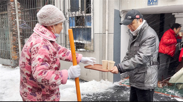 “大家歇一歇,喝點(diǎn)姜茶暖暖身子!”正當(dāng)眾人干勁十足時(shí),一位黨員居民端著熱氣騰騰的姜茶走來(lái),將暖茶遞到每個(gè)人手中?!拔壹依习橹匕Y需要照顧,沒(méi)辦法和大家一起出力,只能煮點(diǎn)熱茶讓大家暖和一下?!币槐?、一聲問(wèn)候,凝聚起鄰里間最真摯的情誼,為掃雪行動(dòng)更添溫情。