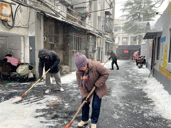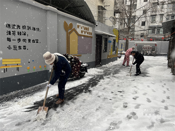 一大早,三名居民志愿者便率先行動(dòng),有人清掃路面浮雪,有人揮舞鐵鍬鏟除薄冰,還有人主動(dòng)疏導(dǎo)過(guò)往居民,提醒大家小心路滑。在志愿者的帶動(dòng)下,越來(lái)越多居民走出家門(mén)加入掃雪隊(duì)伍,原本寂靜的小院變得熱鬧起來(lái),歡聲笑語(yǔ)驅(qū)散了冬日寒意,鄰里距離也在并肩勞動(dòng)中悄然拉近。社區(qū)工作人員帶著掃雪工具趕來(lái)時(shí),正撞見(jiàn)熱火朝天的勞動(dòng)場(chǎng)景,隨即也加入掃雪行列。
