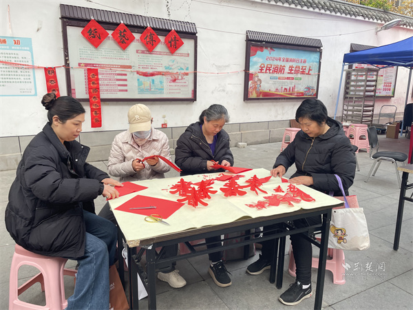 在剪紙區(qū)域,珞珈山社區(qū)教育學(xué)院剪紙班的學(xué)員們展示出精湛的剪紙技藝。一張張普通紅紙在巧手中翻飛流轉(zhuǎn),轉(zhuǎn)瞬就變成“春”字、福字、奔騰駿馬、吉祥花卉等精美的窗花作品,引得居民們駐足圍觀、連連稱贊。