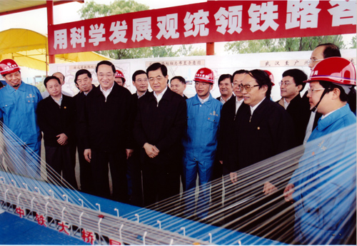 2005年8月22日上午,中共中央總書記、國家主席、中央軍委主席胡錦濤同隨行的中共中央政治局候補委員、中央書記處書記、中央辦公廳主任王剛,在中共中央政治局委員、湖北省委書記俞正聲,湖北省省長羅清泉等陪同下,考察了正在建設(shè)中的武漢天興洲公鐵兩用長江大橋工程,對鐵路建設(shè)作出重要指示。胡總書記指出,武廣鐵路客運專線和武漢天興洲大橋是中國鐵路建設(shè)史上新的里程碑。這條鐵路線的建設(shè)標志著中國鐵路客運專線建設(shè)的開始,今后要建設(shè)更多的鐵路客運專線。一定要把武廣客運專線和天興洲大橋這個我國鐵路建設(shè)史上新的里程碑工程建設(shè)好。