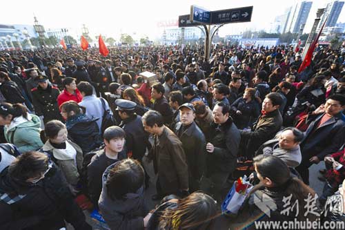 記者今日上午到武昌站轉(zhuǎn)了轉(zhuǎn),和春節(jié)幾天相比,站前廣場(chǎng)的客流明顯增多,幾趟臨客的發(fā)車招牌豎在廣場(chǎng)上,到點(diǎn)會(huì)有引導(dǎo)員引導(dǎo)旅客依次進(jìn)站。可以說(shuō)是忙亂中仍然井然有序。據(jù)了解,昨天,鐵路春運(yùn)客流出現(xiàn)新高潮,武漢鐵路局共發(fā)送旅客51.14萬(wàn),再創(chuàng)歷史新高,旅客發(fā)送量約占全國(guó)鐵路旅客發(fā)送量的十分之一。
