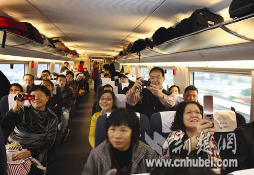 荊楚網(wǎng)消息 (楚天金報(bào)記者譚新杰 通訊員郭金富、劉強(qiáng))12月26日上午9時(shí),三列嶄新的時(shí)速350公里“和諧號(hào)”高速列車(chē)從武漢站、長(zhǎng)沙站和廣州北站同時(shí)首發(fā),標(biāo)志著目前世界上運(yùn)營(yíng)速度最快、一次性建成里程最長(zhǎng)的高鐵新干線——武廣客專(zhuān)正式投入運(yùn)營(yíng)。“陸地飛行下廣州,千里南國(guó)一日還”的時(shí)代已經(jīng)到來(lái)。
