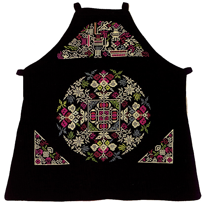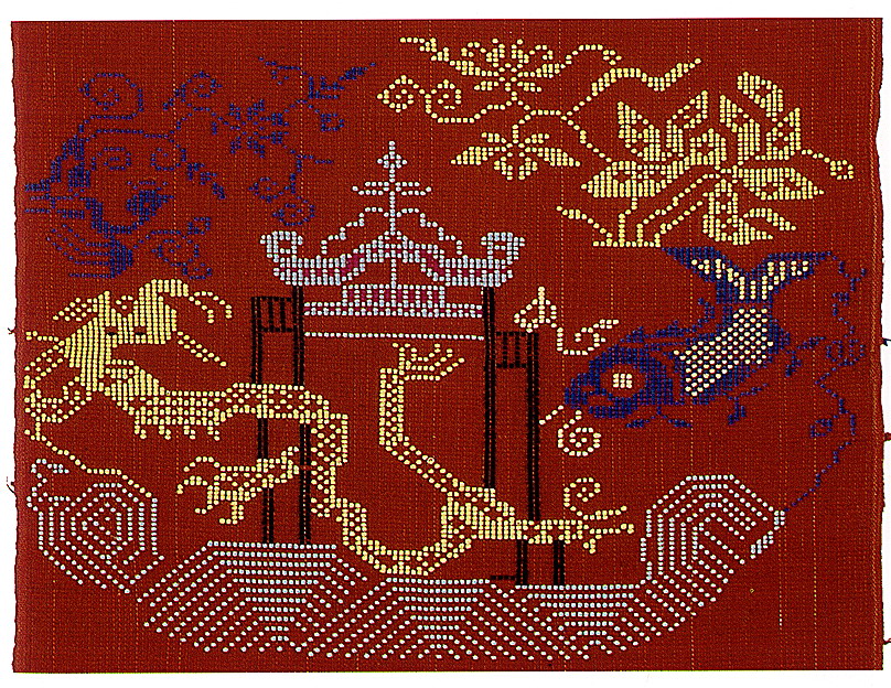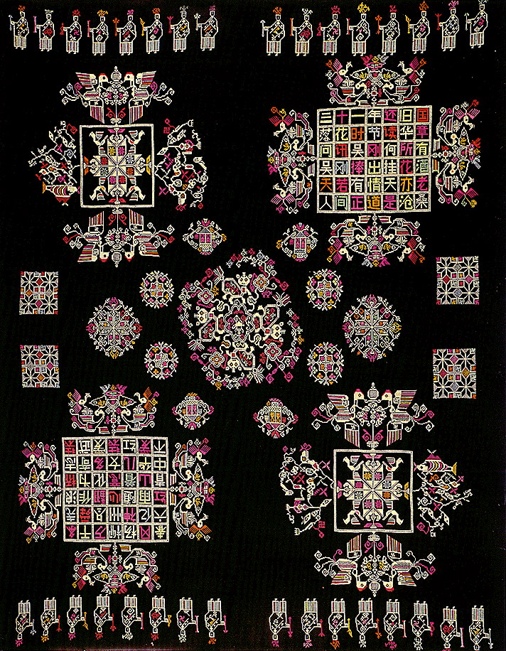 挑花針法有平挑花和十字花兩種,即在平布上面依紗眼用繡花針扣上十字形,然后以此為骨架,填置上多種需要花紋,采取反面挑花正面看手法,其優(yōu)點(diǎn)有二:一是保持清潔;二是便于打結(jié)。構(gòu)圖多是幾何圖形,也有動植物的幾何圖案。其結(jié)構(gòu)主要有對稱式、交叉式、二方連續(xù)式、斜菱形、單獨(dú)紋樣等等。圖案花紋既規(guī)整而又變化多姿,給人以舒暢愉快的感覺。