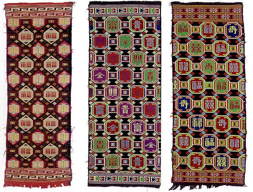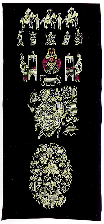土錦以“通以斷緯”為編織手段,受巴楚文化的影響:1、紋飾既抽象又有形,土錦圖案來自對大自然的感受,身邊的物象也是編織者寄情抒懷的選擇,不論是對動物或用具,還是對天象星座,都能運(yùn)用夸張變形的手法,達(dá)到抽象裝飾美的效果。2、色彩上注重原色與復(fù)色的互補(bǔ):運(yùn)用紅、黃、藍(lán)三色,并延伸以赤、黃、青、白、黑為五正色。